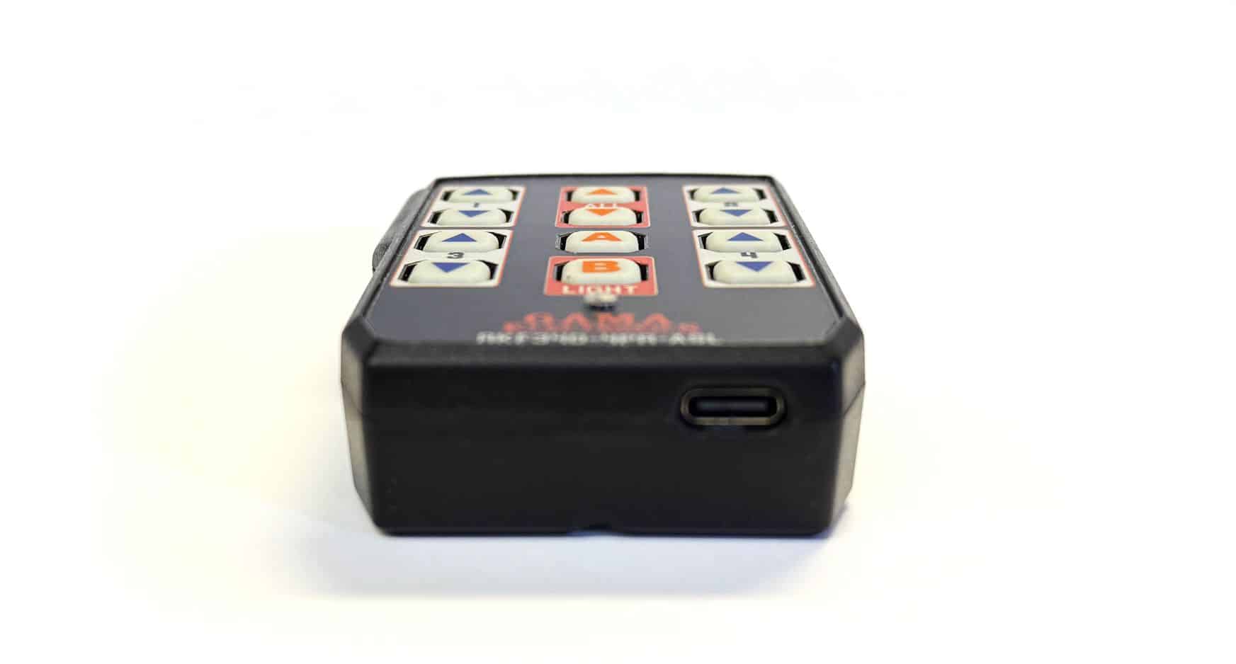 The RKF340-4PR-ASL is a USB-C rechargeable transmitter for use with GAMA Electronics, Inc. remote control systems. This item is a direct replacement for part number RFT340-4PR-TO.